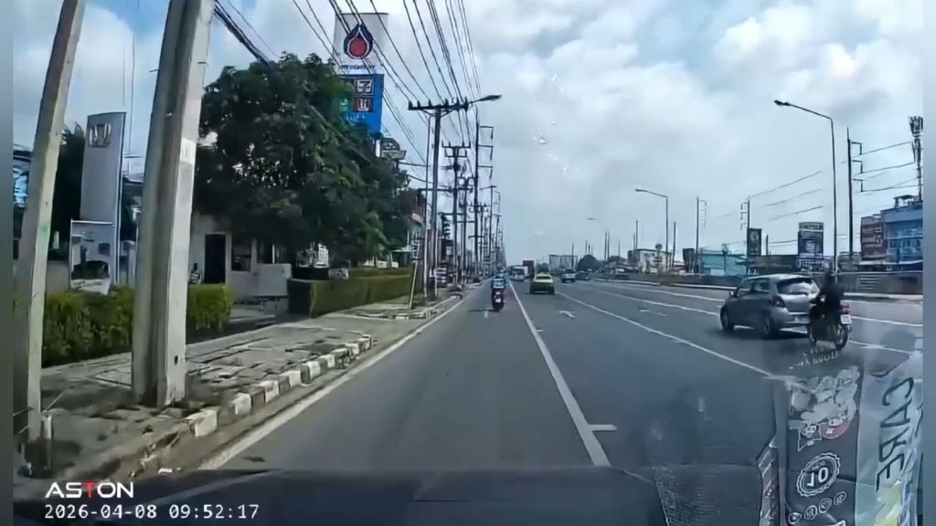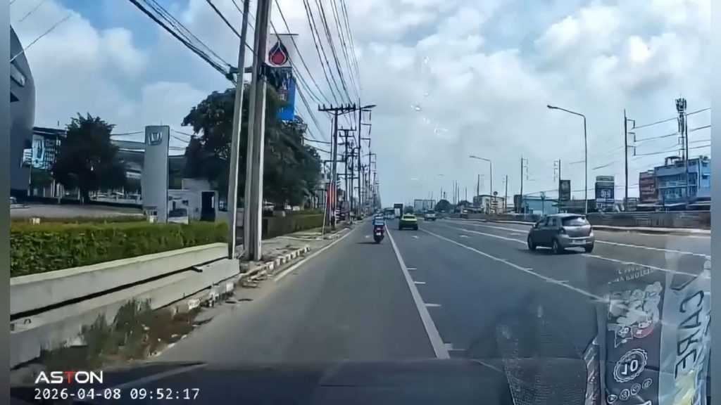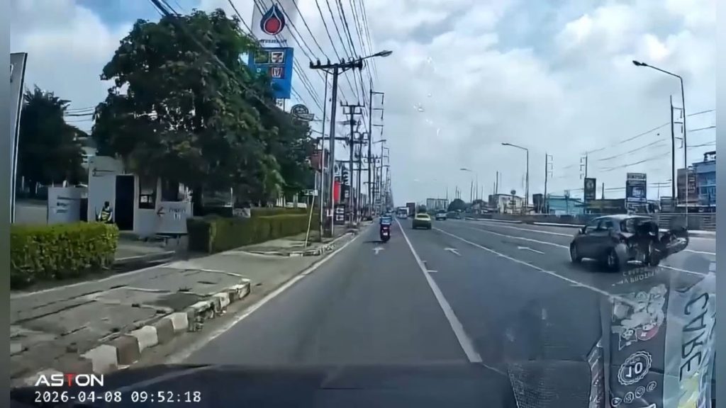 จยย.พุ่งชนท้ายเก๋งเปลี่ยนเลนทับเส้นทึบ เจ็บ 1 ราย กล้องหน้ารถจับภาพชัด ขณะรถยนต์เบี่ยงเลนตัดหน้า ก่อนเกิดเหตุชนอย่างจัง