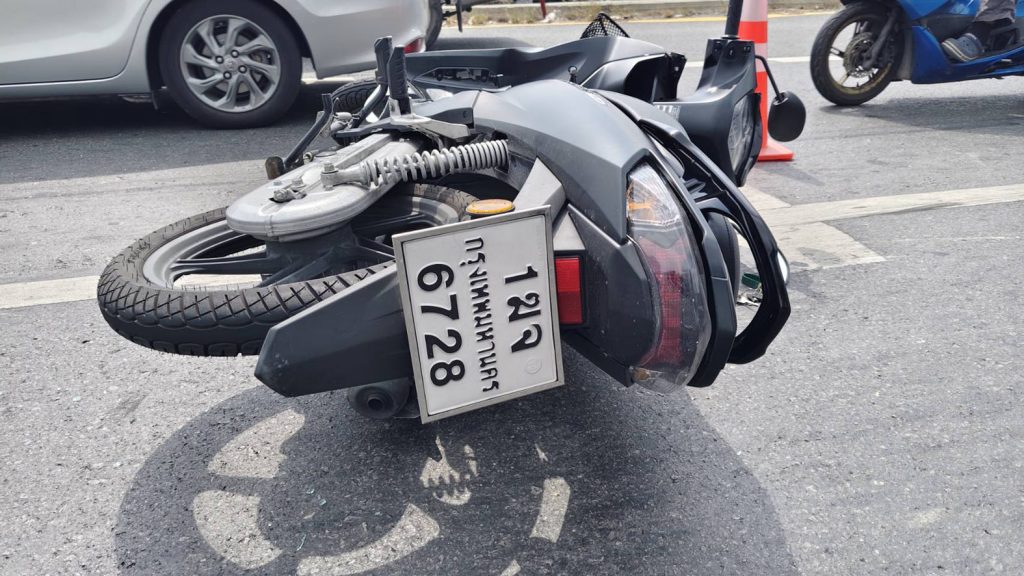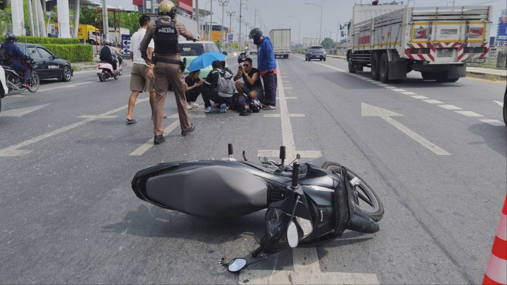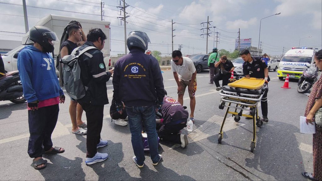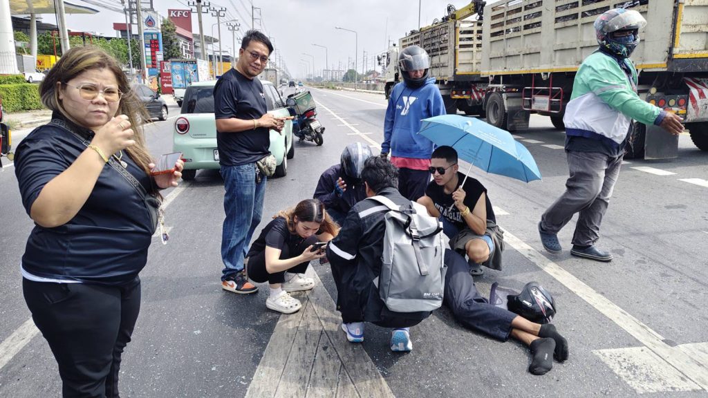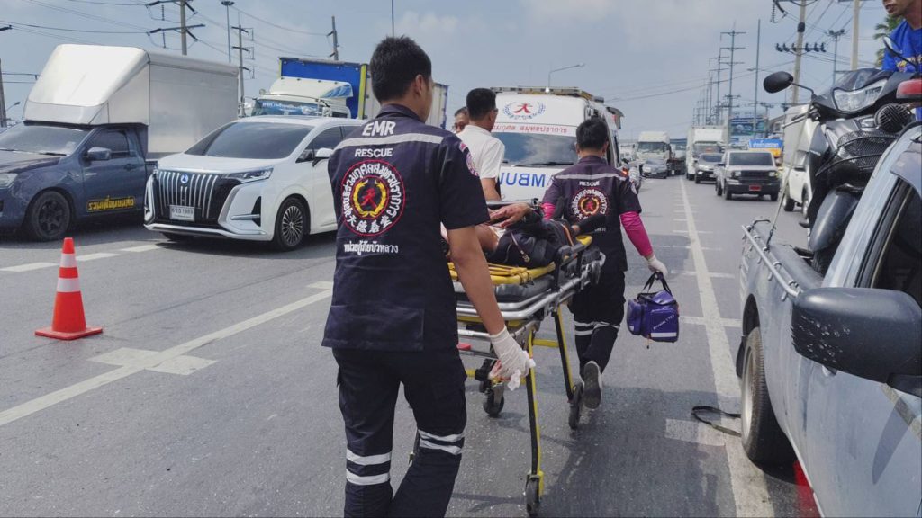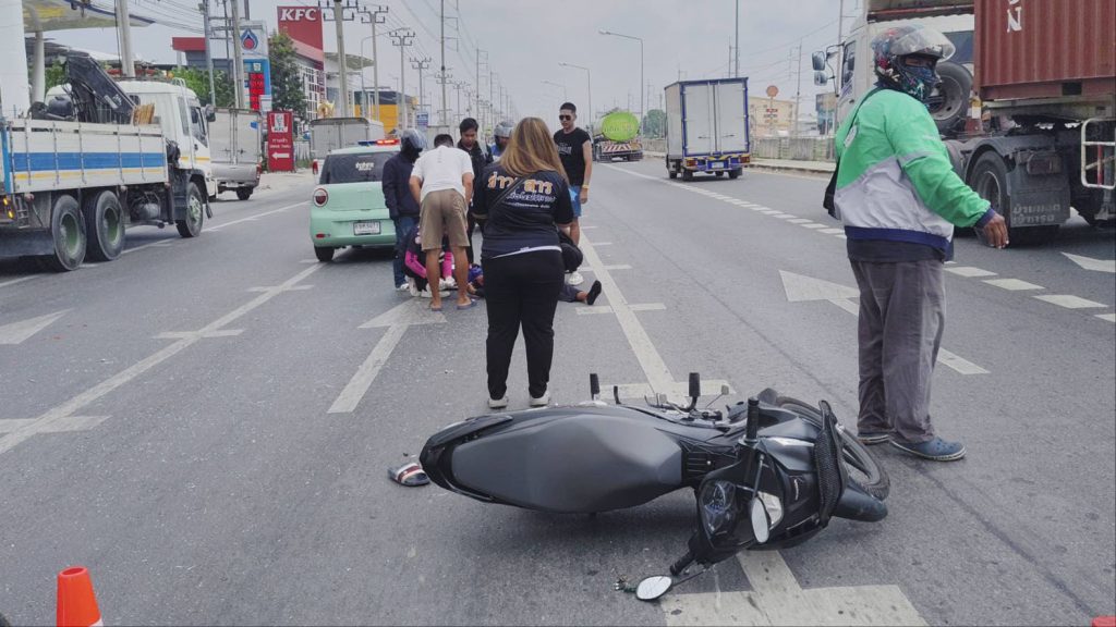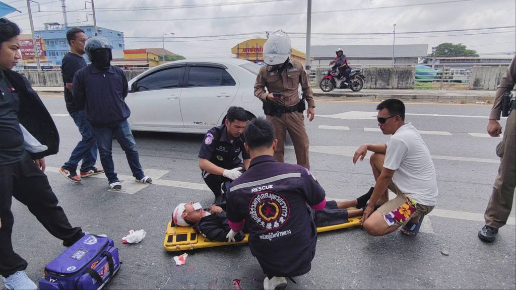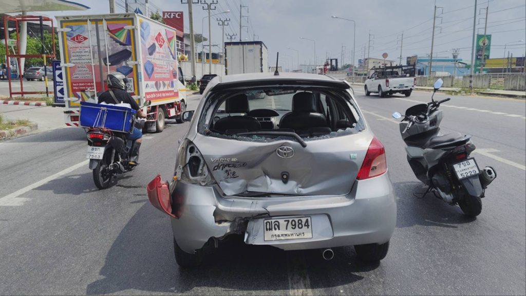 ดเหตุพบรถยนต์นั่งส่วนบุคคล ยี่ห้อโตโยต้า ยาริส สีบรอนซ์เงิน ทะเบียน ณล 7984 กรุงเทพมหานคร สภาพด้านท้ายพังยุบ กระจกหลังแตก กันชนท้ายพังเสียหาย ใกล้กันพบรถจักรยานยนต์ ทะเบียน 1ฆจ 6728 กรุงเทพมหานคร ล้มคว่ำอยู่กลางถนน สภาพด้านหน้าพังเสียหาย พบผู้บาดเจ็บเป็นชาย 1 ราย ทราบชื่อ นายวรวุฒิ พันมนี อายุ 33 ปี มีบาดแผลแตกที่หน้าผาก และที่ใต้คาง เลือดออกจำนวนมาก เจ้าหน้าที่กู้ชีพให้การช่วยเหลือปฐมพยาบาลเบื้องต้น ก่อนเร่งนำส่งโรงพยาบาล