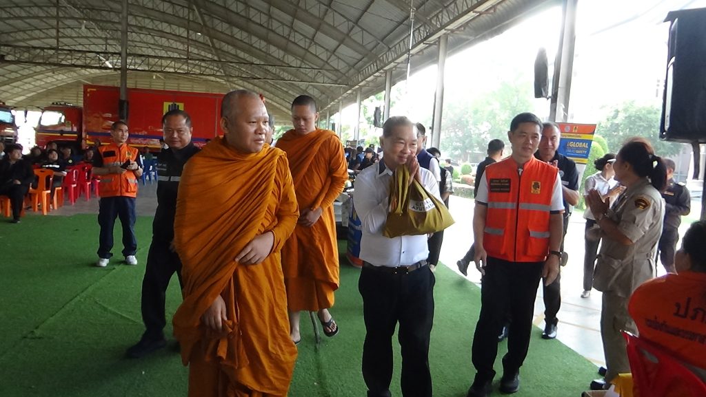 โดยมี นายสมศักดิ์ ปริศนานันทกุล อดีตรัฐมนตรีว่าการกระทรวงเกษตรและสหกรณ์ นายนที มนตริวัต ผู้ว่าราชการจังหวัดอ่างทอง นายไพบูลย์ ศุภบุญ รองผู้ว่าราชการจังหวัดอ่างทอง น.ส.สุกัญญา กุลสุวรรณ์ ปลัดจังหวัดอ่างทอง หัวหน้าสำนักงานป้องกันและบรรเทาสาธารณภัยจังหวัดอ่างทอง หัวหน้าส่วนราชการ นายอำเภอ นายประยูร ภู่แส รองกรรมการผู้จัดการบริษัท กลางคุ้มครองผู้ประสบภัยจากรถ จำกัด และภาคีเครือข่ายความปลอดภัยทางถนนจากทุกภาคส่วน ร่วมในพิธี