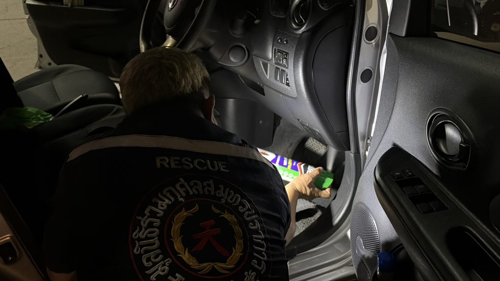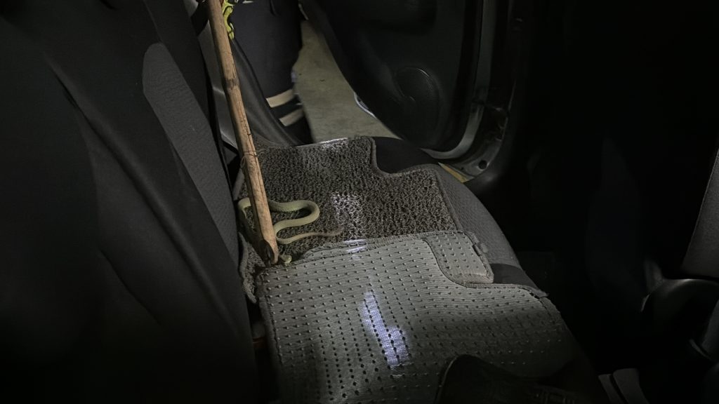 ต่อมาเจ้าหน้าที่กู้ภัยมูลนิธิร่วมกุศลสมุทรปราการพร้อมอุปกรณ์จับสัตว์เลื้อยคลาน ได้เข้าตรวจสอบรถยนต์นิสสัน มาร์ช สีบลอนท์ ทะเบียน 1กฐ 1325 กทม. ของคนไข้รายดังกล่าวอย่างละเอียด โดยใช้เวลากว่า 20 นาที ในการมุดค้นตามซอกหลืบ จนกระทั่งพบตัวการซ่อนตัวอยู่ในรถ เมื่อนำออกมาได้พบว่าเป็น “งูเขียวหางไหม้” ขนาดความยาวประมาณ 30 เซนติเมตร จึงได้นำใส่ภาชนะที่มิดชิดแล้วนำไปปล่อยคืนสู่ธรรมชาติ เบื้องต้นคนไข้รายดังกล่าวอยู่ในความดูแลของแพทย์อย่างใกล้ชิด และอาการปลอดภัยแล้ว