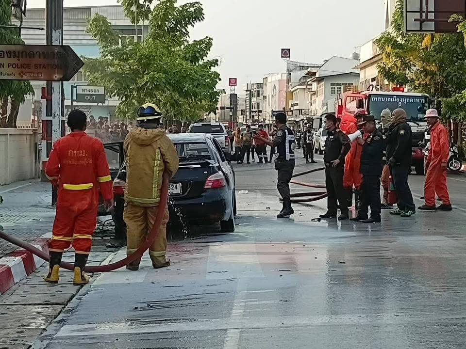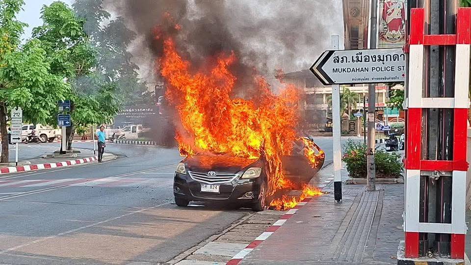 จากการสอบถามนาย วีระ ซาเสน อายุ 70 ปี อดีตข้าราชการครู บ้านเลขที่ 164 หมู่ 1 ตำบลเหล่าหมี อำเภอดอนตาล จังหวัดมุกดาหาร เจ้าของรถเก๋งคันเกิดเหตุ เล่าว่า ตนเองพร้อมครอบครัวได้ขับรถมาทำธุระในเมืองมุกดาหาร พอมาถึงวงเวียนหอนาฬิกา รถมีกลิ่นเหม็น จึงประคองนำรถ หาที่จอดที่ปลอดภัย และมาถึงข้าง รพ.มุกดาหาร จึงจอดรถและดับเครื่องยนต์ พร้อมคนที่มาด้วยกันทั้งหมด5 คน ตนเอง ตา ยาย หลาน รีบลงจากรถสักพักมีประกายไฟลุกพรึบ ขึ้นในห้องโดยสาร และมีพลเมืองดีได้ แจ้งเจ้าหน้าที่ตำรวจ และแจ้งรถดับเพลิง มาช่วยเหลือครอบครัวของตนเอง